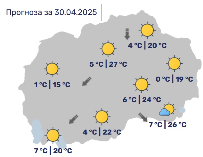 За првомајскиот празник времето ќе биде сончево со мала до умерена облачност. Ќе дува умерен, вдолж Повардарието засилен ветер од северен правец. Попладне ќе има услови за локален краткотраен дожд и ретки грмежи. Минималната температура ќе се движи од 2 до 9, а максималната од 20 до 27 Целзиусови степени.