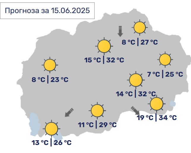 И утре времето ќе биде претежно сончево и топло. Ќе дува слаб до умерен ветер од северен правец. Дневните температури ќе достигнат до 34 Целзиусови степени.