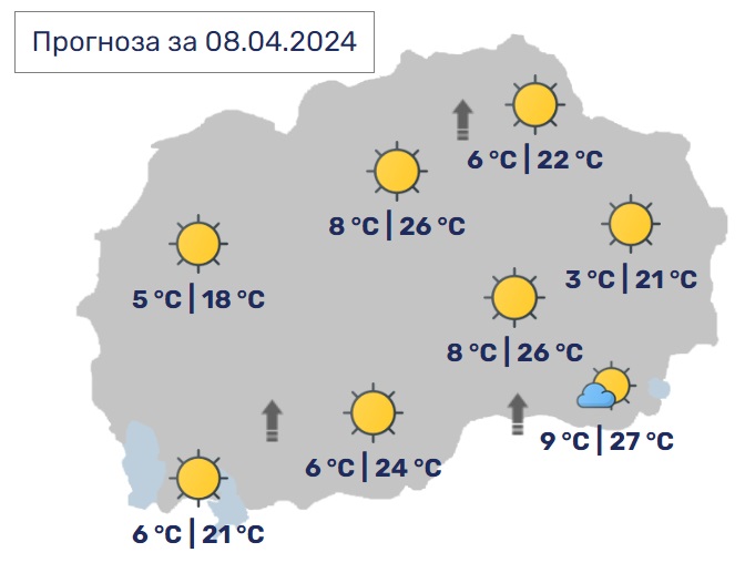 И утре времето ќе биде сончево и топло со мала локална облачност. Ќе дува слаб до умерен ветер од јужен правец. Во Скопје сончево и топло со слаб ветер од јужен правец.