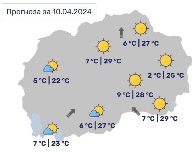 Дневните температури ќе се движат од 21 до 29 Целзиусови степени.