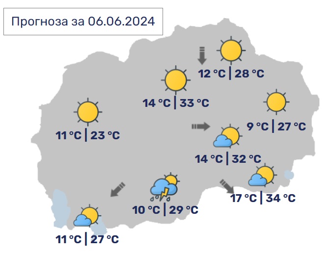 Во Скопје ќе биде сончево и топло со умерена облачност. Ќе дува слаб до умерен ветер од северозападен правец. Минималната температура ќе се спушти до 14, а максималната ќе достигне до 33 степен.
