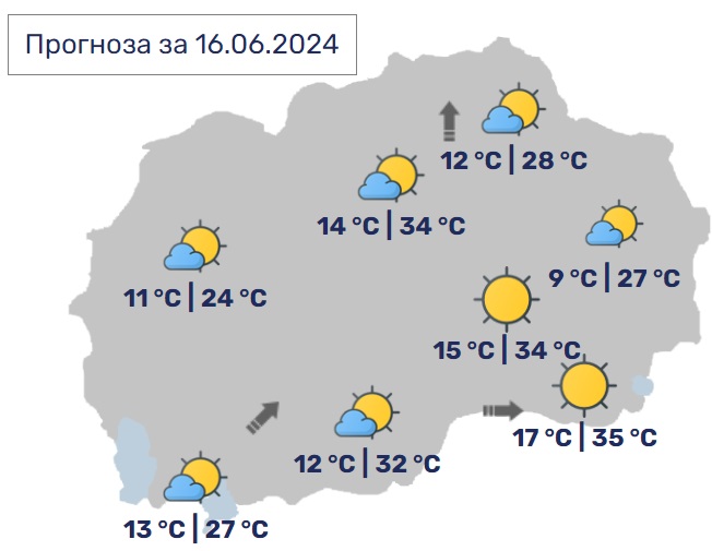 Утре времето ќе биде сончево и топло со мала до умерена облачност. Попладне ќе има локална појава на нестабилност со повремен пороен дожд и грмежи. Локално процесите ќе бидат поинтензивни во форма на краткотрајно невреме. Дневните температури ќе се движат од 27 до 35 Целзиусови степени.