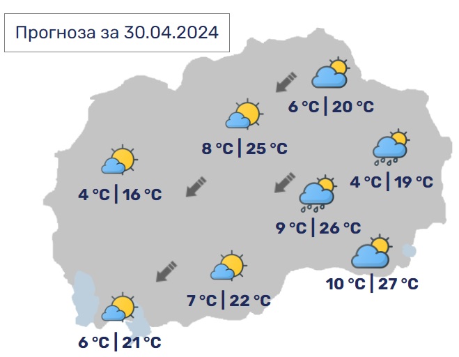Во Скопје сончево со мала до умерена облачност. Ќе дува слаб до умерен ветер од североисточен правец. Минималната температура ќе се спушти до 8, а максималната ќе достигне 25 степени.