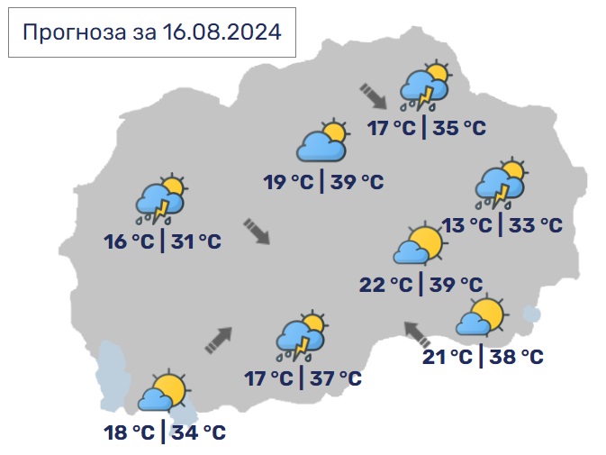 Во Скопје сончево и топло, попладне со умерен развој на нестабилна облачност. Ќе дува слаб ветер од северозападен правец. Минималната температура ќе се спушти до 19, а максималната ќе достигне до 39 степени.