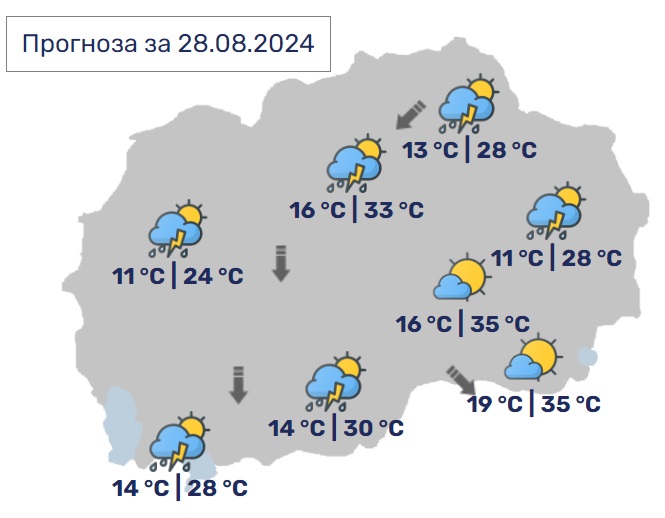 Во Скопје сончево и топло со мала до умерена облачност и со слаб до умерен ветер од северен правец. Попладне ќе биде нестабилно со пороен дожд и грмежи, а во делови од котлината ќе има услови за краткотрајно невреме. Минималната температура ќе се спушти до 16, а максималната ќе достигне до 33 степени.
