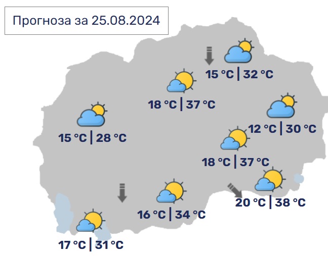 Минималната температура ќе биде во интервал од 12 до 20, а максималната ќе достигне од 30 до 38 Целзиусови степени. УВ-индексот ќе има вредност 7.