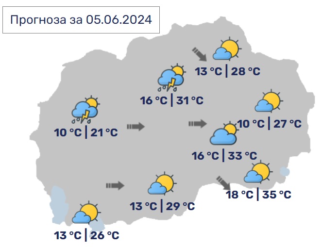 Дневните температури ќе се движат од 21 до 35 Целзиусови степени.
