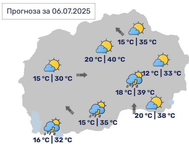 Утре сончево и многу топло со мала до умерена облачност. Ќе дува слаб до умерен ветер претежно од југозападен правец. Дневните температури ќе достигнат до 41 Целзиусов степен.