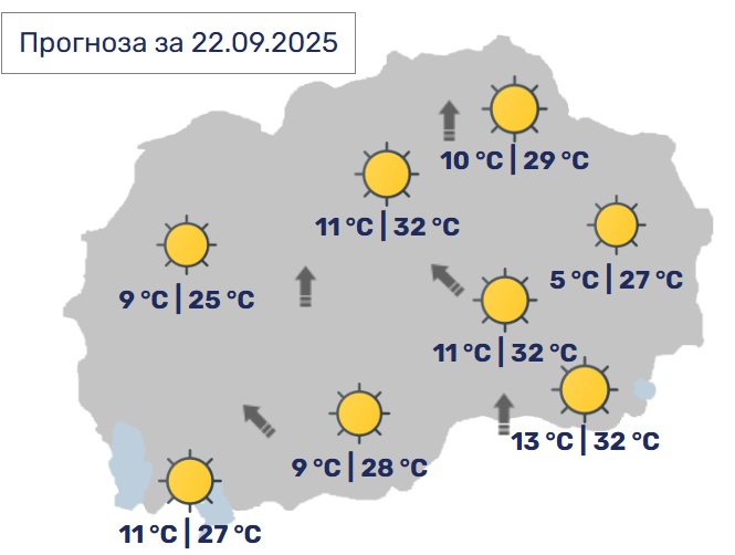 Утре времето ќе биде претежно сончево и топло со температури до 33 Целзиусови степени. Ќе дува слаб до умерен ветер од јужен правец.