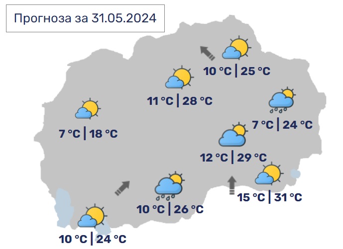 Минималната температура ќе биде во интервал од 7 до 15 Целзиусови степени, а максималната ќе достигне од 24 до 31 степен. УВ индексот ќе биде 7.
