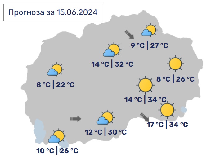 Во Скопје сончево и топло со мала облачност. Ќе дува слаб до умерен ветер претежно од северен правец. Минималната температура ќе се спушти до 14, а максималната ќе достигне до 32 степени.