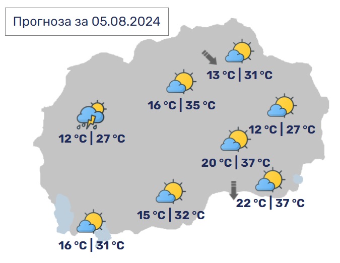 Во Скопје ќе биде сончево и топло со мала до умерена облачност и со слаб до умерен северен ветер. Минималната температура ќе се спушти до 16, а максималната ќе достигне до 35 степени.