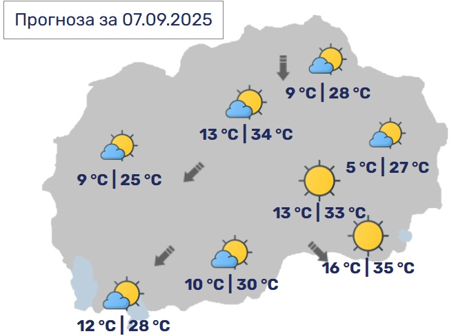 Во Скопје, слично време со мала до умерена облачност попладне. Ќе дува слаб до умерен северен ветер. Минималната температура ќе се спушти до 13, а максималната ќе достигне до 34 степени.