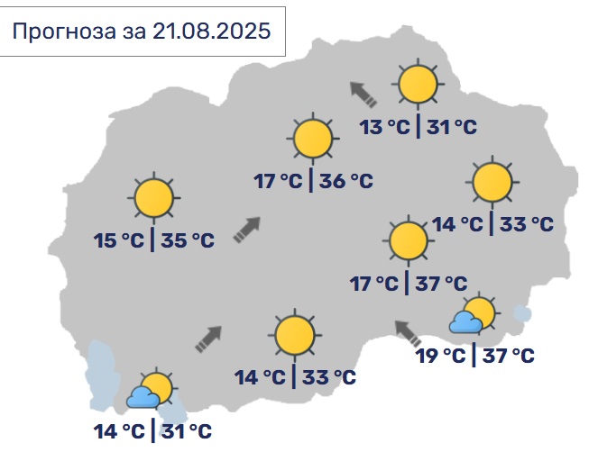 Во Скопје ќе биде сончево со мала до умерена облачност. Ќе дува слаб до умерен ветер од југозападен правец. Минималната температура ќе се спушти до 17, а максималната ќе достигне до 36 Целзиусови степени.