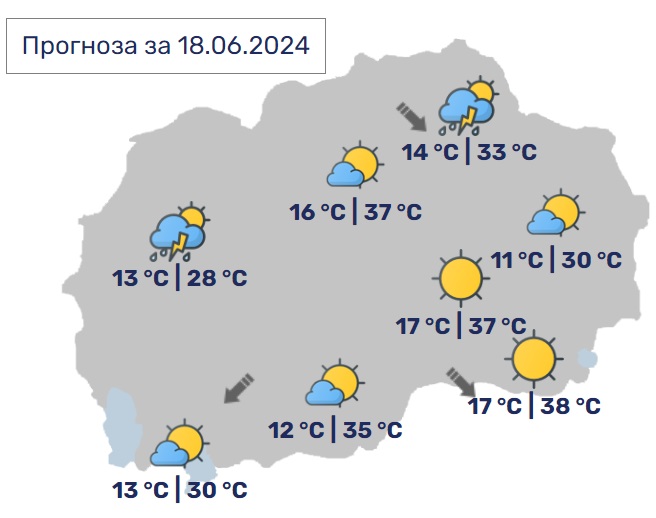 Утре во попладневните часови, претежно во планинските подрачја, ќе има услови за изолирана локална појава на пороен дожд и грмежи. Потоа се очекува стабилно и многу топло време. Најтопло ќе биде особено на југоистокот во четврток, петок и сабота. Во четврток преку денот краткотрајно ќе засилува претежно северен ветер.