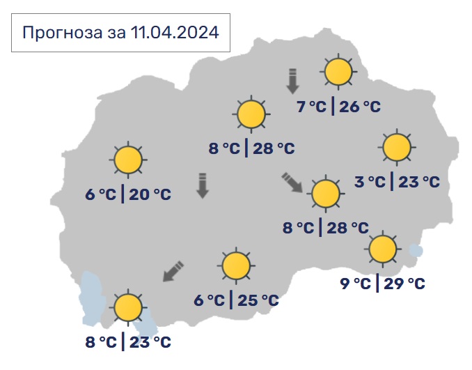 Утре ќе биде сончево и топло со мала до умерена локална облачност. Ќе дува слаб до умерен ветер од северен правец.