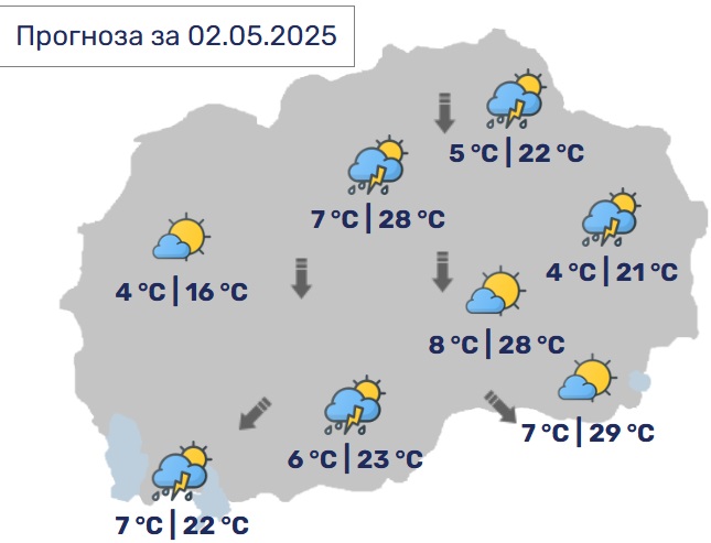УХМР информира дека следува период на топло време. Од почетокот на новата седмица се очекува нестабилно време со локален пороен дожд, грмежи и засилен ветер.