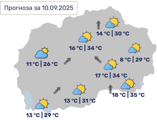 Во Скопје, сончево и топло со мала до умерена облачност. Ќе дува слаб до умерен, во делови од котлината повремено засилен ветер од јужен правец.