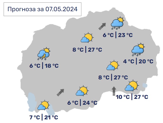 Утре времето ќе биде променливо облачно, попладне нестабилно на повеќе места со пороен дожд и грмежи. Локално процесите ќе бидат во форма на невреме со обилен пороен дожд за кратко време и засилен ветер.
