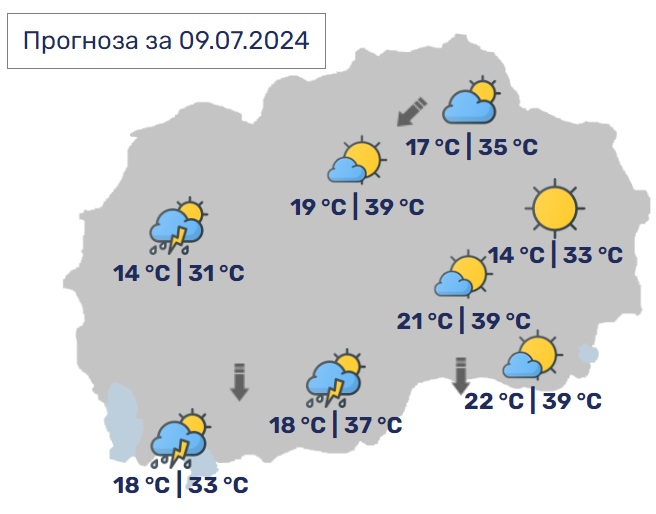 И утре времето ќе биде сончево и многу топло со мала локална облачност со температури до 40 Целзиусови степени. Ќе дува слаб до умерен ветер од североисточен правец.