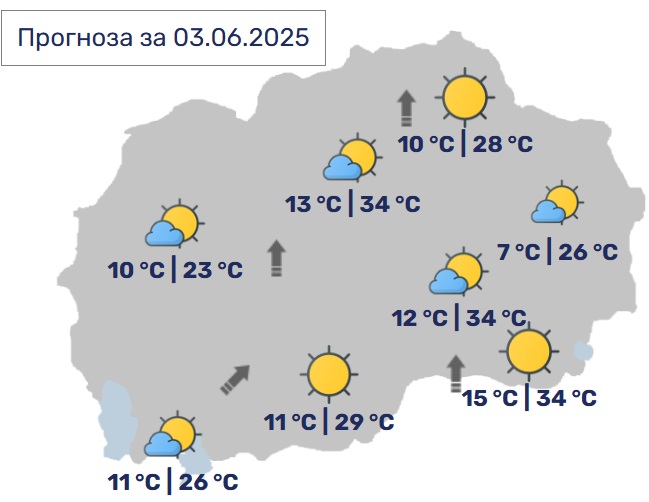 Утре времето ќе биде сончево и топло со мала до умерена локална облачност. Попладне во планинските региони ќе има услови за пороен дожд и грмежи. Ќе дува слаб до умерен ветер од јужен правец. Максималната температура ќе се движи од 26 до 35 Целзиусови степени.