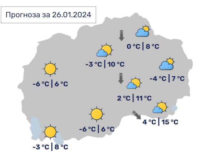 Во Скопје сончево со мала до умерена облачност. Ќе дува слаб до умерен, повремено засилен ветер од северен правец. Минималната температура ќе се спушти до -3, а максималната ќе достигне 10 степени.