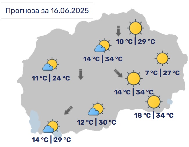 Утре времето ќе биде сончево и топло со мала локална облачност. Ќе дува слаб до умерен ветер од северен правец. Попладне во планинските региони ќе има услови за појава на нестабилност со пороен дожд и грмежи. Дневните температури ќе достигнат до 35 Целзиусови степени.
