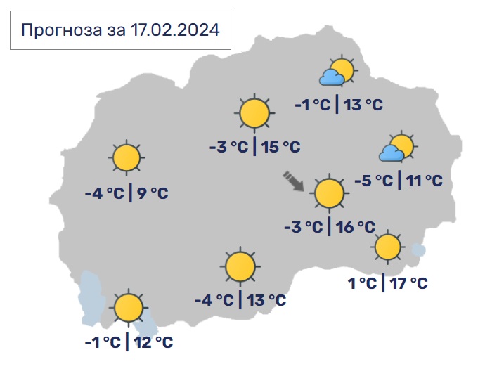 Времето во Македонија денеска ќе биде сончево со мала локална облачност и претежно тивко. Минималната температура ќе биде во интервал од -5 до 1, а максималната ќе достигне од 9 до 17 Целзиусови степени.