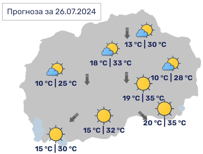 Утре времето ќе биде претежно сончево и топло со слаб до умерен северен правец. Во Скопје сончево и топло со слаб до умерен северен ветер. Дневните температури ќе се движат од 27 до 38 Целзиусови степени, а УВ индексот ќе биде 9.