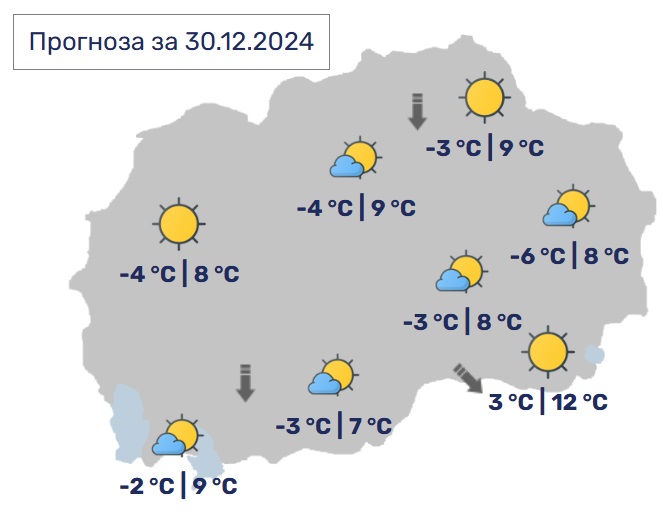 Во Скопје наутро со услови за појава на магла, во текот на денот сончево со мала облачност. Ќе дува слаб ветер од северен правец. Минималната температура ќе се спушти до -4, а максималната ќе достигне до 9 степени.