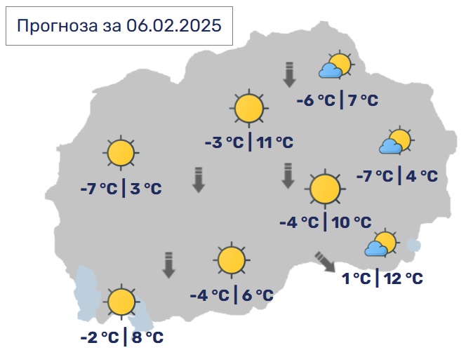 Утре наутро ќе биде студено со услови за појава на магла по одделни котлини. Преку денот сончево со мала до умерена облачност. Ќе дува слаб до умерен ветер од југоисточен правец. Минималните температури ќе се движат од -7 до 3, а максималните од 3 до 10 Целзиусови степени.