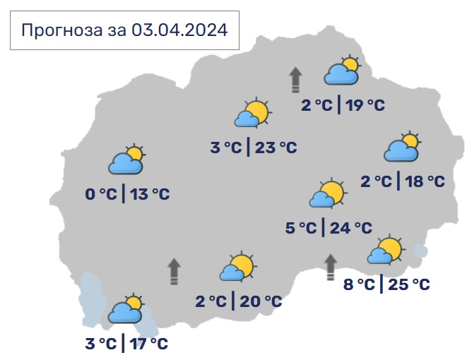 Следува период на сончево време со мала до умерена облачност. До петок утринските температури ќе бидат пониски, а преку денот ќе дува умерен, повремено засилен северен ветер. Од сабота температурите ќе бидат во пораст.