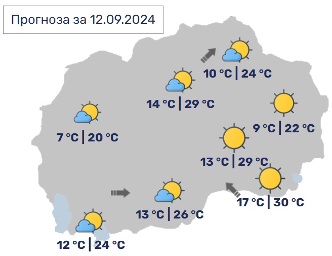 Дневните температури ќе се движат од 19 до 28 Целзиусови степени.