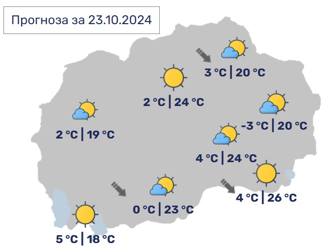 Утре утрата ќе бидат студени со појава на магла по одделни котлини и речни долини. Преку денот сончево со мала локална облачност. Ќе дува слаб ветер претежно од југоисточен правец.