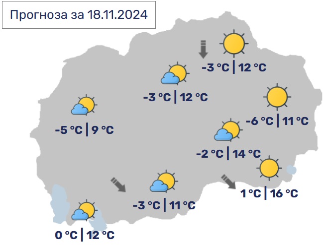 Утре наутро ќе биде студено со услови за појава на магла по одделни котлини. Преку денот сончево со мала до умерена облачност. Ќе дува слаб до умерен ветер од југоисточен правец. Кон крајот на денот облачноста ќе се зголеми и во текот на ноќта во западните делови ќе има локален дожд, на планините снег. Минималните температури ќе се движат од -6 до 0, а дневните од 10 до 16 Целзиусови степени.