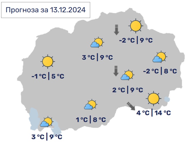 Утре времето ќе биде променливо облачно, претпладне со појава на магла по одделни котлини. Попладне и во текот на ноќта ќе има повремени врнежи од дожд, а на планините од снег. Ќе дува слаб до умерен, а долж Повардарието повремено засилен ветер од југоисточен правец. Дневните температури ќе се движат од 3 до 10 Целзиусови степени.