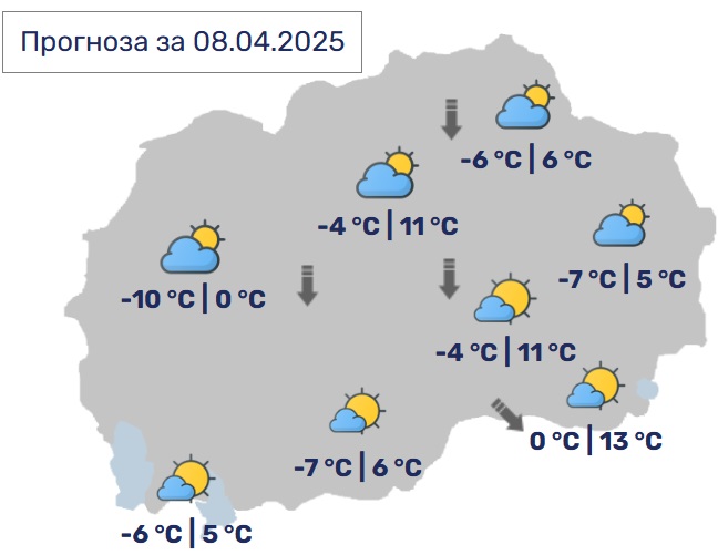 Утрe наутро времето ќе биде ведро и студено, преку денот сончево со мала до умерена облачност. Ќе дува умерен, долж Повардарието повремено засилен ветер од северен правец. Минималната температура ќе се движи од -7 до 0, а максималната од 7 до 16 Целзиусови степени.
