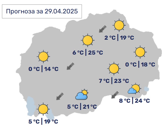 Утрe наутро времето ќе биде ведро и посвежо, а преку денот сончево со мала до умерена локална облачност. Ќе дува умерен ветер од северен правец. Минималната температура ќе се движи од 1 до 8, а максималната од 19 до 26 Целзиусови степени.