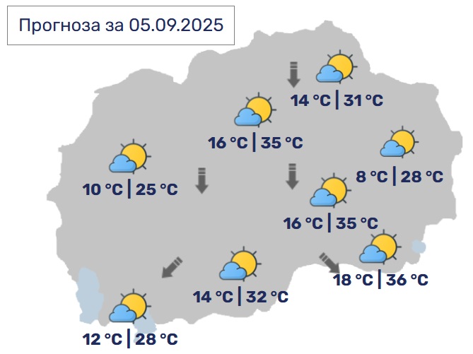 Утре времето ќе биде сончево со мала до умерена локална облачност и дневни температури до 36 Целзиусови степени. Ќе дува слаб до умерен, наместа долж Повардарието повремено засилен ветер од северен правец.