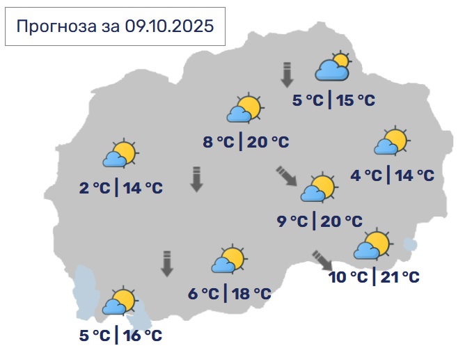 Утре времето ќе биде сончево со мала до умерена локална облачност и дневни температуро од 16 до 22 Целзиусови степени. Ќе дува слаб до умерен ветер од северен правец.