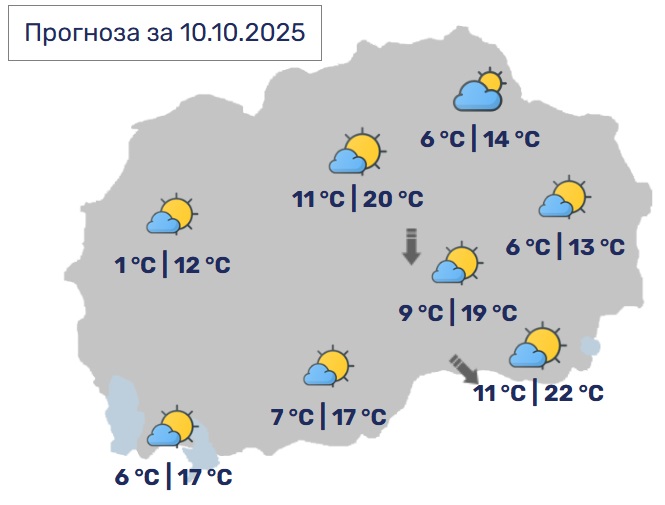 Утре времето ќе биде сончево со мала до умерена локална облачност и дневни температури од 14 до 21 Целзиусов степен. Ќе дува слаб до умерен, а наместа долж Повардарието повремено засилен ветер од северен правец.
