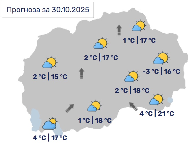 Утре претпладне по одделни котлини ќе има услови за појава на магла. Во текот на денот времето ќе биде сончево со мала до умерена облачност и дневни температури од 16 до 22 Целзиусови степена. Ќе дува слаб ветер од југоисточен правец.