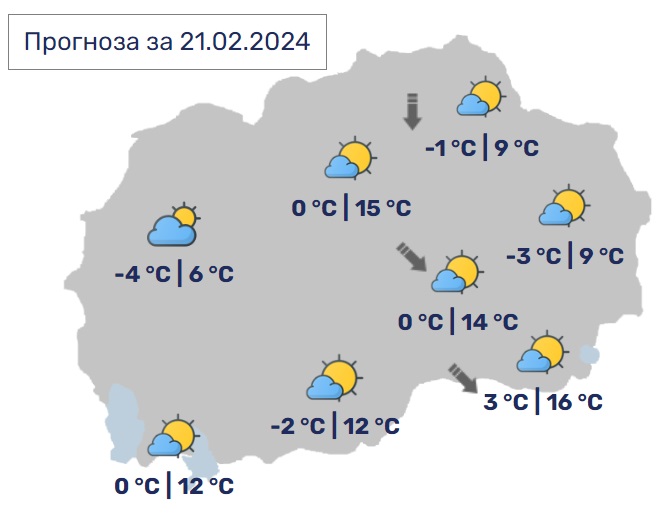 Во Скопје сончево со мала до умерена облачност и со слаб ветер од северен правец. Минималната температура ќе се спушти до 0, а максималната ќе достигне 15 степени.