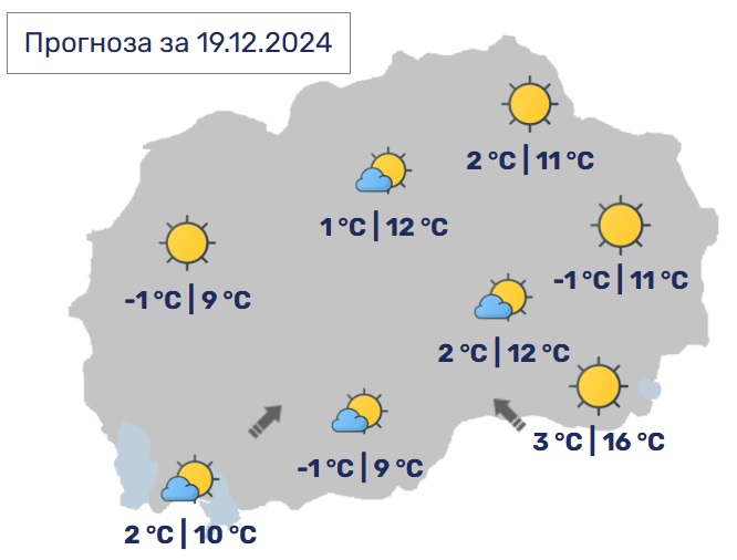 Во Скопје наутро со услови за појава на магла, преку денот сончево со мала облачност и слаб јужен ветер.