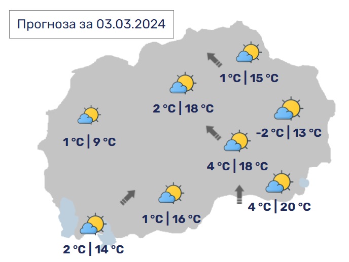 Во Скопје променливо облачно, во вечерните часови и во текот на ноќта со врнежи од дожд. Ќе дува слаб до умерен, попладне во делови од котлината повремено засилен ветер југоисточен правец. Дневните температури ќе се движат од 9 до 17 Целзиусови степени.