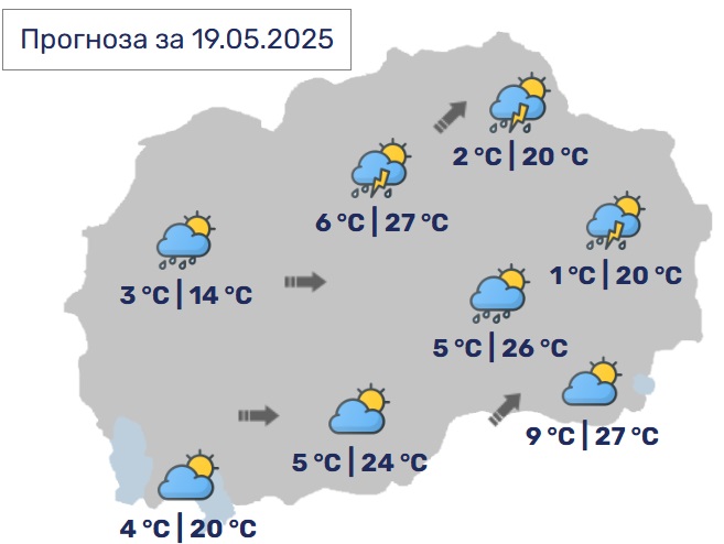 Утре времето ќе биде сончево со мала до умерена облачност. Попладне ќе има услови за локален слаб дожд. Ќе дува слаб до умерен ветер од северозападен правец. Максималната температура ќе се движи од 20 до 28 Целзиусови степени.