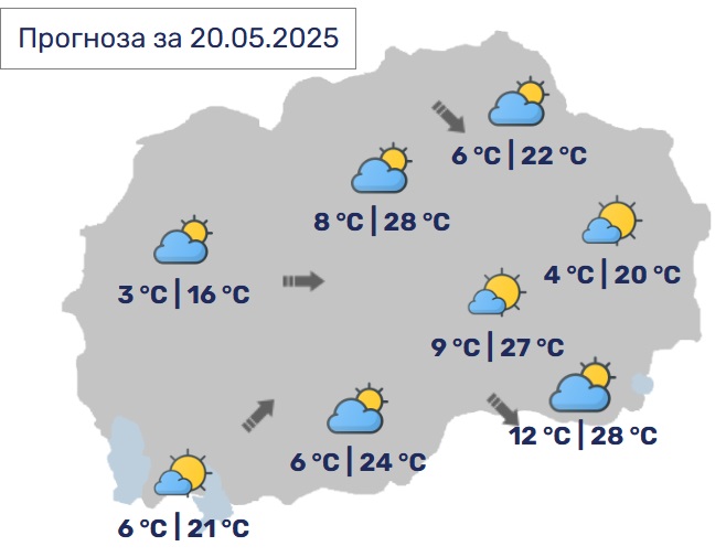 Утре времето ќе биде променливо облачно со сончеви периоди. Во попладневните часови ќе биде нестабилно со локален пороен дожд и грмежи, наместа во форма на невреме со засилен ветер и изолирана појава на град. Ќе дува слаб до умерен ветер од јужен правец. Максималната температура ќе се движи од 21 до 27 Целзиусови степени.