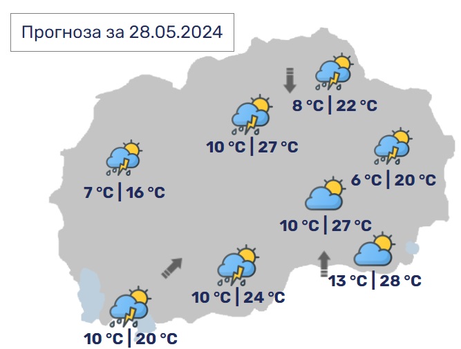 Утре времето ќе биде сончево со мала до умерена облачност. Попладне, особено во западните и крајните источни делови ќе биде нестабилно со пороен дожд, грмежи и услови за локална појава на невреме.