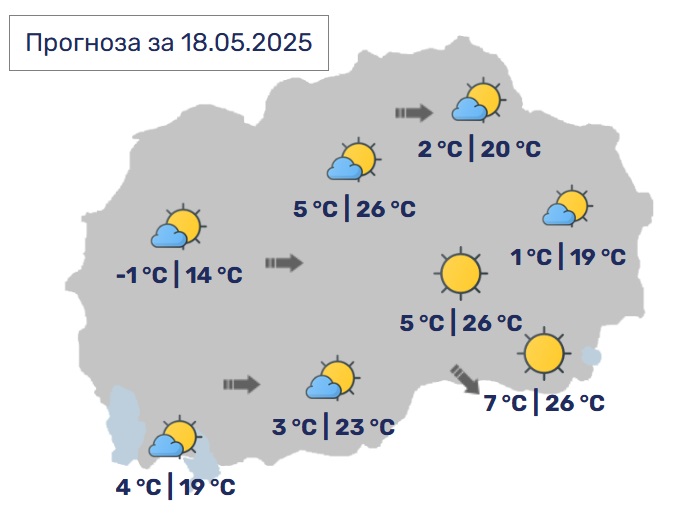 Утре времето ќе биде сончево со мала до умерена облачност. Попладне ќе има локална појава на нестабилност со пороен дожд и грмежи. Ќе дува слаб до умерен, а наместа во западните делови повремено засилен ветер од западен правец. Максималната температура ќе се движи од 20 до 28 Целзиусови степени.