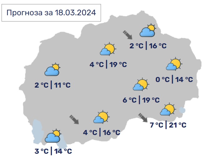 Дневните температури ќе се движат од 6 до 16 Целзиусови степени.